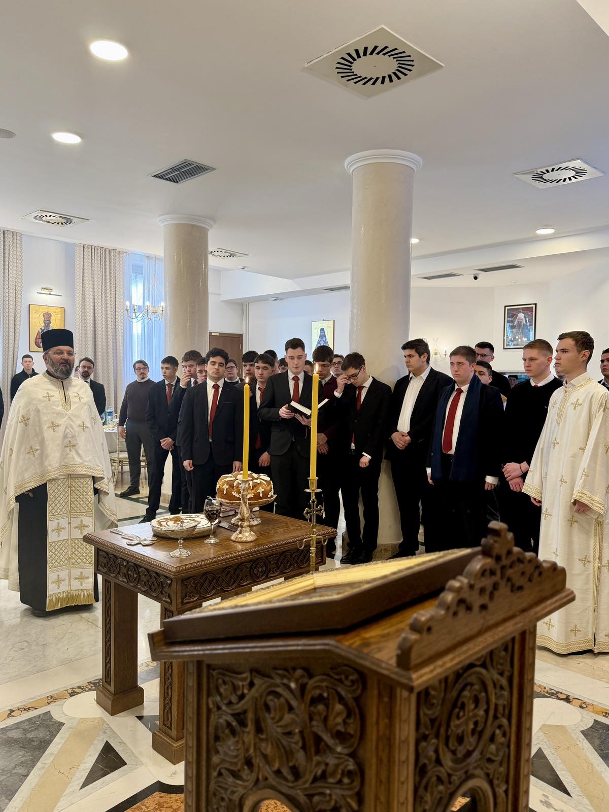 Дана 27.01.2026. године а о празнику првог српског Архиепископа Светог Саве, служена је Света Архијерејска Литургија у Храму на Врачару на којој су молитвено учешће узели Ректор, професори и ученици Богословије. Светом Литургијом је началствовао Његова Светост Патријарх српски Господин Порфирије уз саслуживање више Архијереја наше Свете Православне Цркве. Патријарх Порфирије је у својој беседи истакао значај Светог Саве за наш народ и живот сваког појединца уопште. У наставку Свете Литургије, у просторијама наше Школе протојереј Ђорђе Стојисављевић-шеф кабинета Његове Светости, пресекао је славски колач и поздравио је све окупљене честитајући данашњи празник. Подсећајући на Житије Светог Саве написано од стране Теодосија, отац Ђорђе је нагласио усвајање начина живота који води у живот вечни, а кога је применио Светитељ у свом животу, као и сви они који су Светитеља опонашали. Цитирао је и реч Патријарха Порфирија да ако будемо имали Христа на првом месту, све ће бити на свом месту и додао да пошто је Свети Сава на месту у Царству небеском које му припада, онда ћемо и ми следећи његов пут бити на месту које нам је намењено.